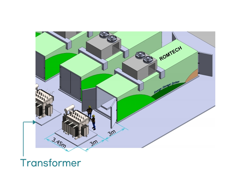 Install a transformer in front of each container - Securing installation space per container(3.45m x 3m) - According to the transformer specification (size) Installation position/direction adjustment