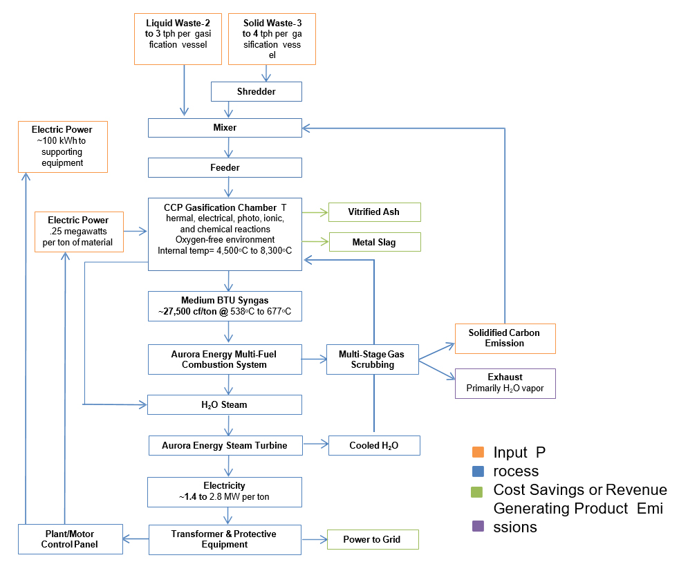 Compared to earlier plasma-arc decomposition processes, Green Frog Power’s system uses only one-fourth the energy to affect virtually total
